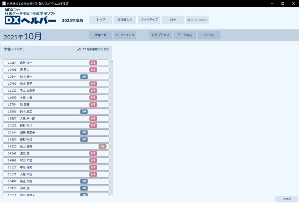 様式1の出力は「FF1出力」をクリックするだけ。あとは作成した様式1を外来データ提出支援ツールを使用しチェックを行います。エラーがある場合はDXヘルパーで情報修正行い、提出用データを作成し10月分の作業は完了です。