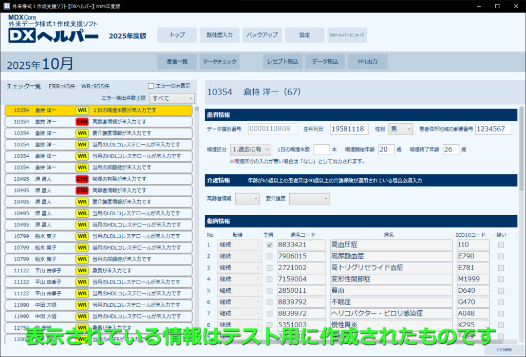 レセプトや専用シートで10月分の情報取り込みが完了したらデータチェックを行います。エラーと警告の一覧が表示されます。